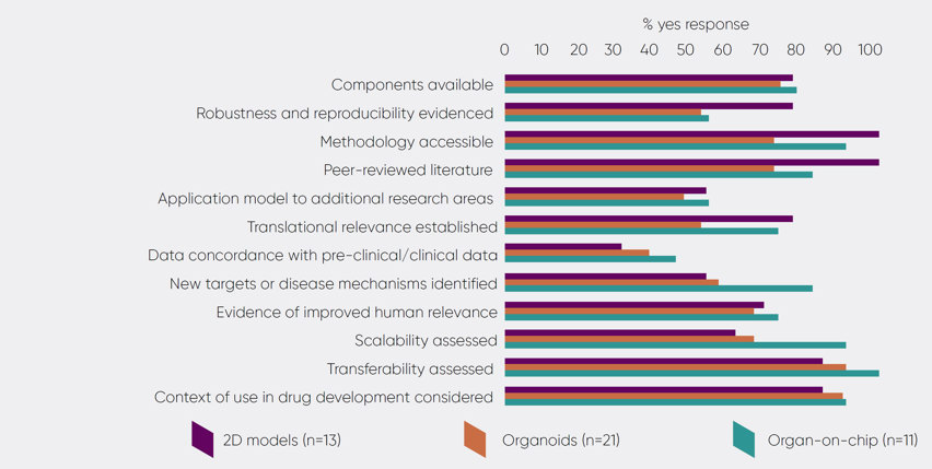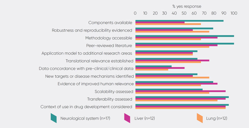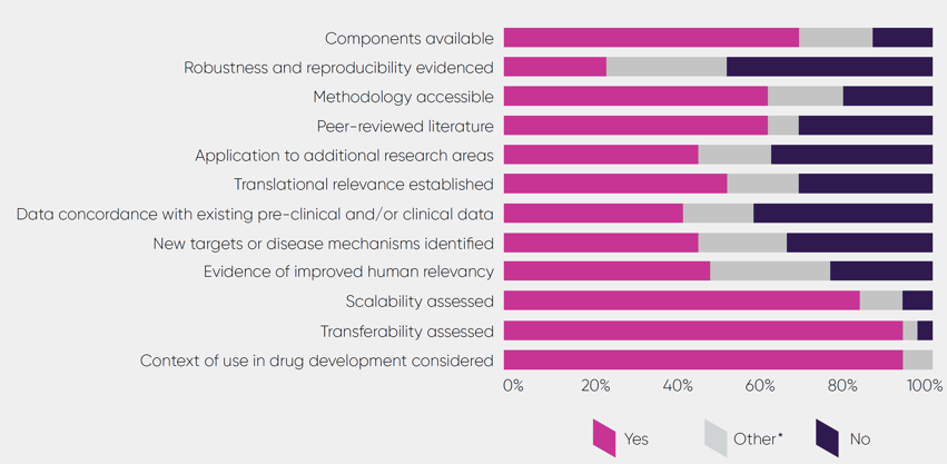 • The translational relevance. Evidence of translational relevance provide confidence that the model functions as it is intended to. Demonstrating translational relevance through clear translational endpoints was cited as a priority for several of the industry scientists consulted. 52 per cent of respondents reported that their models had been validated and could demonstrate translational relevance with clear functional endpoints. Where this had not been completed, additional feedback provided indicated that the work was ongoing or there was early evidence of this being assessed.