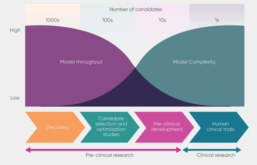 Discovery (early) research: Testing thousands of potential candidates so pre-clinical models used will typically have high throughput and scalability, but lower complexity.