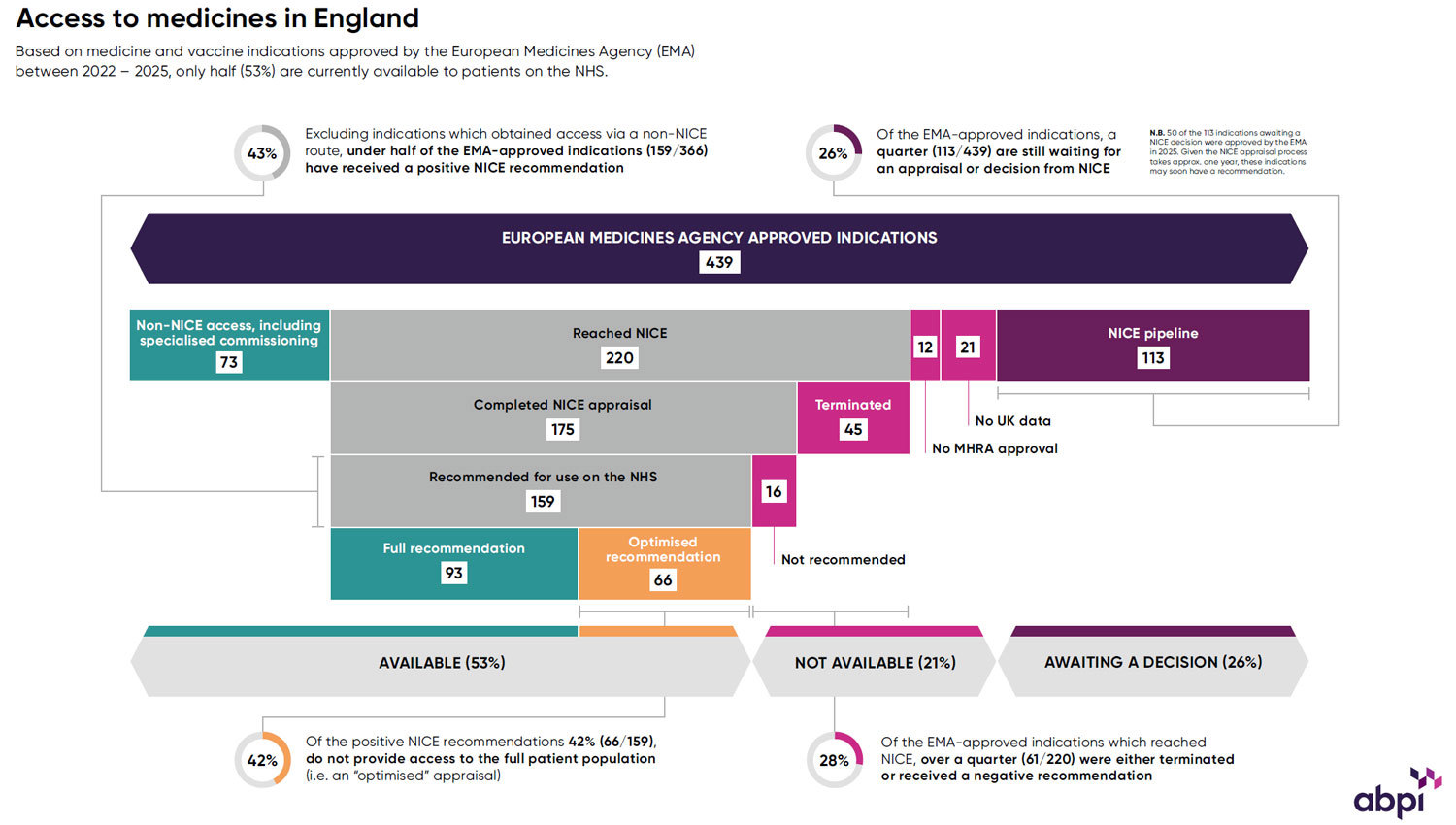 - Non-NICE access = Indications available in England through routes other than a NICE appraisal, such as NHS specialised commissioning, vaccines, or medicines with UK sales data showing they are being used.